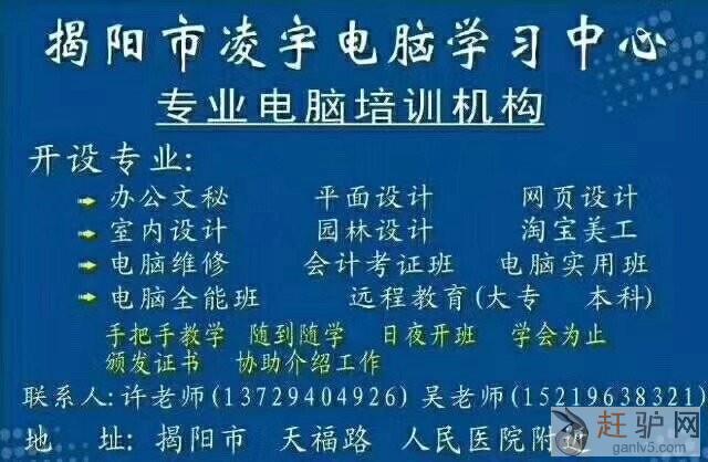揭阳市凌宇电脑学习中心,现阶段已为揭阳众多的大中小型企业提供了不少的电脑专业人才,并得到这些公司的反馈和大力支持。区别于其它电脑院校对学员只重理论不重实践的弊病,本学习中心结合公司的集体优势,通过大量的实践,使我们的学员能更快更好的适应工作,满足各企业的要求。联系人:许老师电话:13729404926....